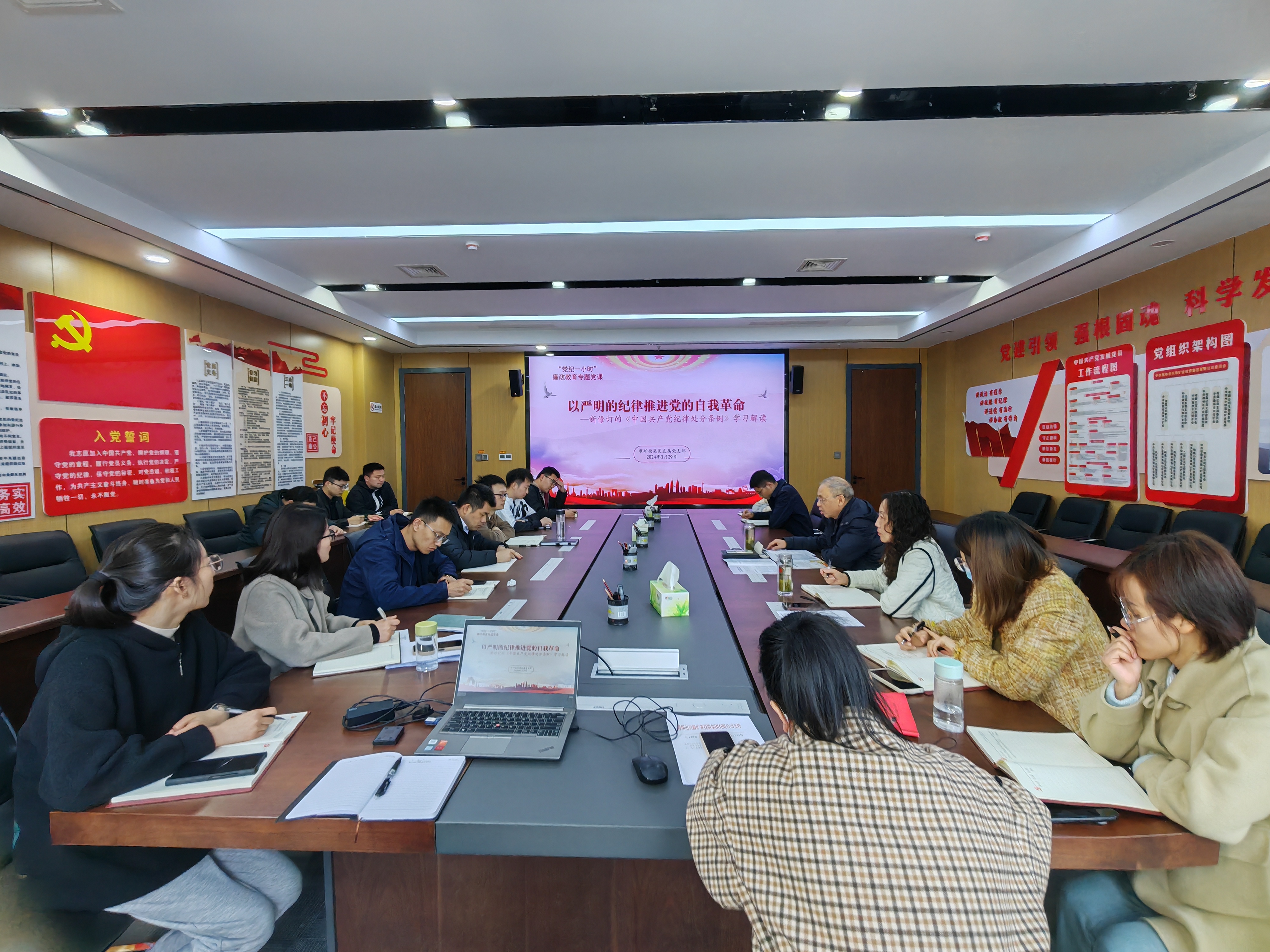 為進一步學深悟透習近平總書記關于黨的自我革命的重要思想,推進全面從嚴治黨向縱深發(fā)展,3月29日,市礦投集團以學習貫徹新修訂的紀律處分條例為契機,開展“黨紀一小時”宣講教育活動。市礦投集團黨委委員、駐市礦投集團紀檢監(jiān)察組組長芮金保以“以嚴明的紀律推進黨的自我革命“為題,圍繞學習解讀新修訂《中國共產黨紀律處分條例》進行宣講。