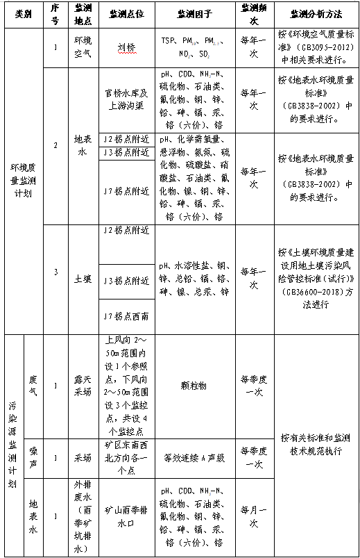 (6)招標(biāo)范圍及內(nèi)容:對(duì)興天礦業(yè)諭興礦進(jìn)行環(huán)境監(jiān)測(cè)和檢測(cè),包括但不限于土壤、地下水、廢水、廢氣、噪聲等污染源進(jìn)行監(jiān)測(cè)和檢測(cè),每月出具監(jiān)測(cè)和檢測(cè)報(bào)告。監(jiān)測(cè)和檢測(cè)報(bào)告需滿足各級(jí)主管單位、國家法律法規(guī)、行業(yè)檢測(cè)標(biāo)準(zhǔn)、《滁州市興天礦業(yè)有限公司安徽省天長市諭興地區(qū)建筑用玄武巖礦年產(chǎn) 800 萬噸露天采礦項(xiàng)目環(huán)境影響報(bào)告表》中所涉及范圍等要求,保證審批順利通過。